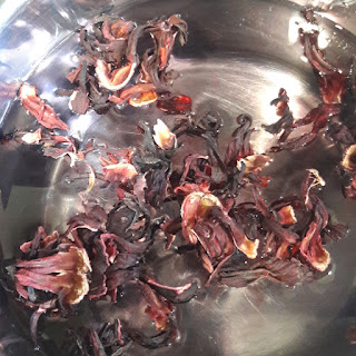 - Como ya os he comentado, las flores de hibiscus las compramos secas, así que lo primero que vamos a hacer es poner a rehidratar en un cazo 3 cucharadas de flores en litro y medio de agua durante una hora.