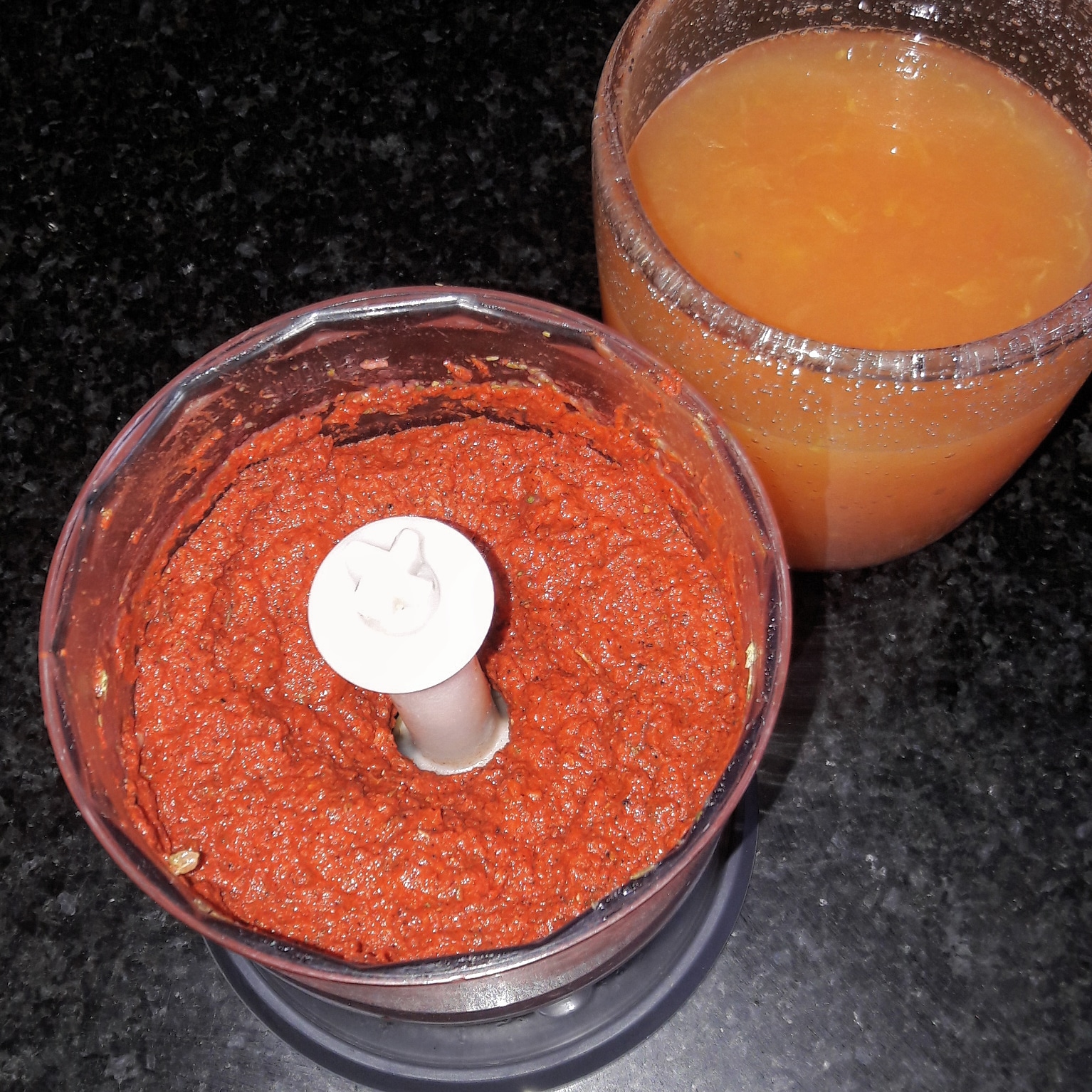 - Exprimimos el zumo de las naranjas sanguinas (o de naranja y pomelo) y añadimos más o menos la mitad a la pasta de achiote, ajo y especias, salamos al gusto y mezclamos bien. (El resto de zumo, que lo utilizaremos para la cocción).